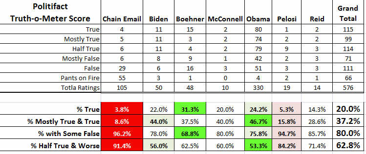 Of course, Internet chain emails were far and away the absolute worst score and led the percent of the worst rating available “Pants of Fire” false – which is not surprising because there is little to no accountability for their messages. OVER 91% of the rated Internet communiques had, at best, half-truths !!!! Given these stats, why do so many people fall for this stuff????